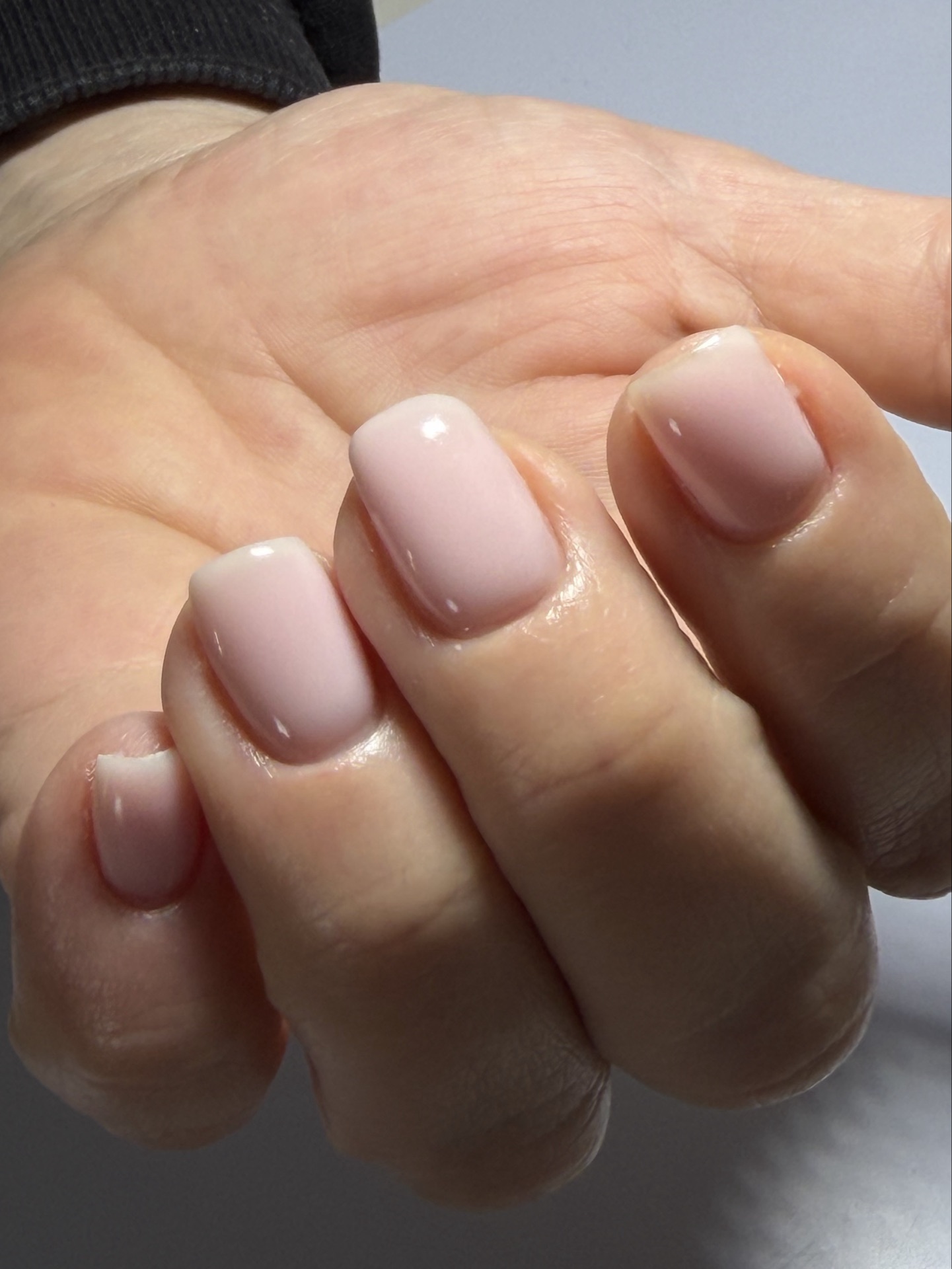 Manucure russe avec gainage et vernis semi-permanent pour une tenue longue durée.