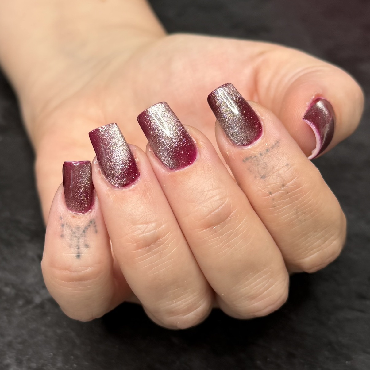 Nail art de base incluant chrome, finition pailletée, et cat eyes.