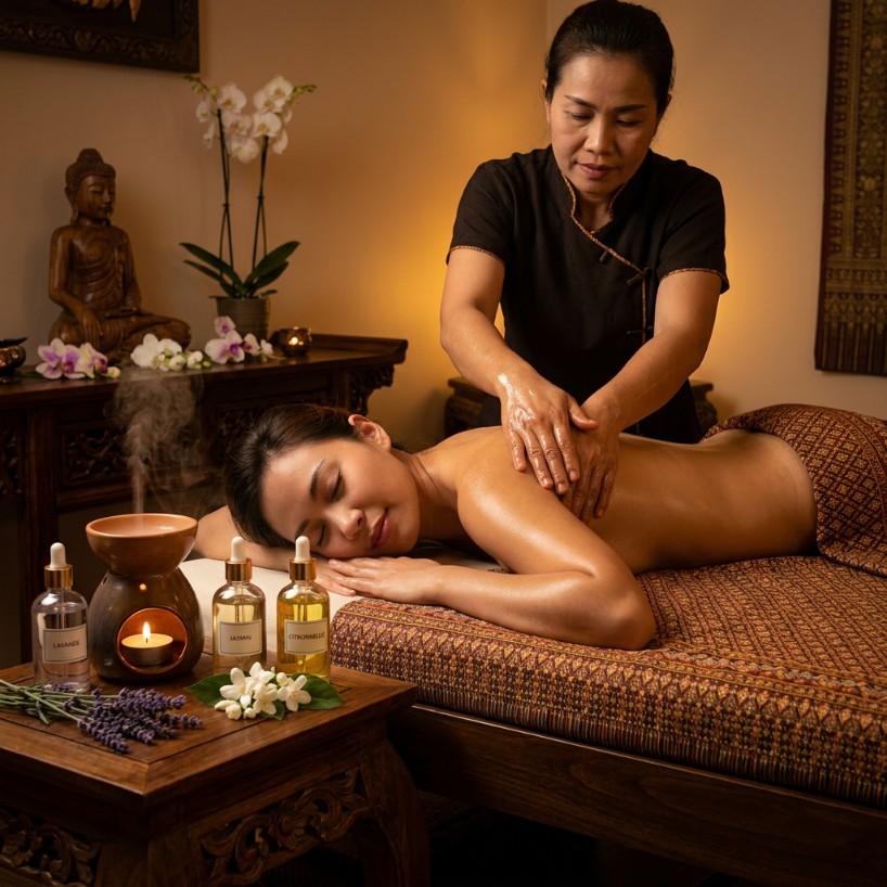 Offrez-vous un moment de détente absolue avec le massage thaï aux huiles chez Chanothaï, votre salon de massage thaïlandais aux Lilas (93), à deux pas de Paris. Le Nuad Naman associe la précision des gestes traditionnels thaïlandais à la douceur d'huiles essentielles chaudes, sélectionnées pour leurs vertus apaisantes et régénérantes : lavande, jasmin ou citronnelle. Réalisé par un masseur thaïlandais diplômé et formé en Thaïlande, ce soin enveloppant travaille l'ensemble du corps en suivant les lignes d'énergie pour une relaxation en profondeur. Les mouvements fluides et les pressions douces permettent de dénouer les tensions musculaires, d'améliorer la circulation sanguine, de nourrir la peau et de favoriser un lâcher-prise total. Corps et esprit se reconnectent dans un état de calme profond, propice à un meilleur sommeil et un rééquilibrage global. Ce massage aux huiles est particulièrement recommandé pour les personnes en quête de douceur, sensibles aux pressions appuyées ou souhaitant allier bien-être musculaire et soin de la peau dans une expérience relaxante et authentique.