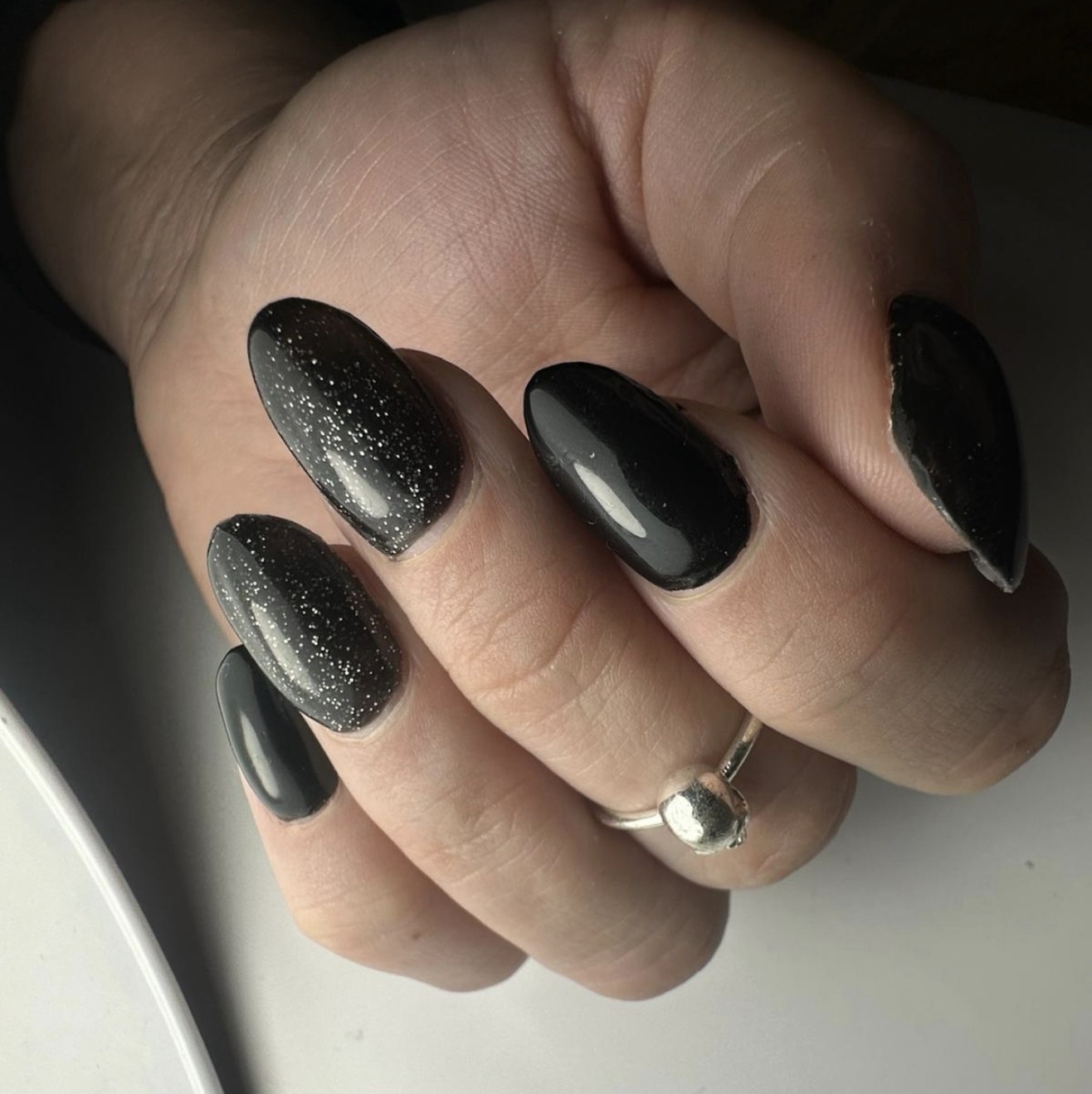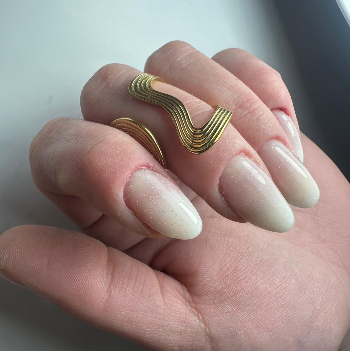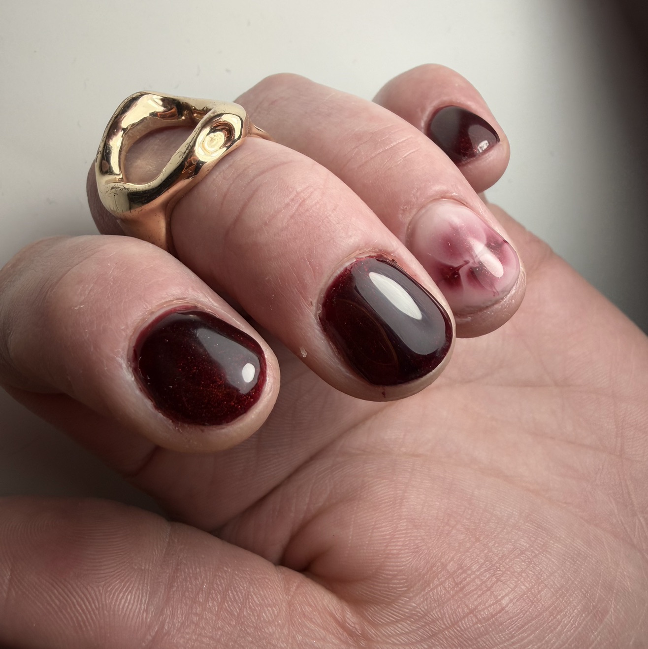Vernis semi-permanent appliqué sur les mains pour une finition élégante et durable.